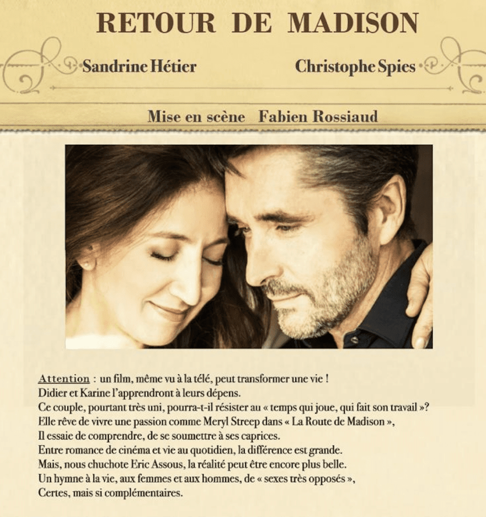 Ils viennent de visionner SUR LA ROUTE DE MADISON. Elle est toute retournée et se pose une multitude de questions sur son couple… Lui ne comprend pas et trouve que tout va bien…!